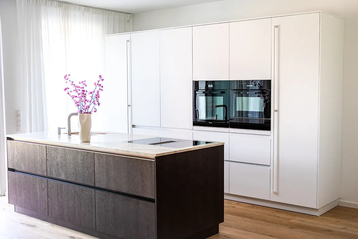 Elegante Designküche mit edlen Naturmaterialien, modernster Bora-Technik und cleveren Stauraumlösungen.